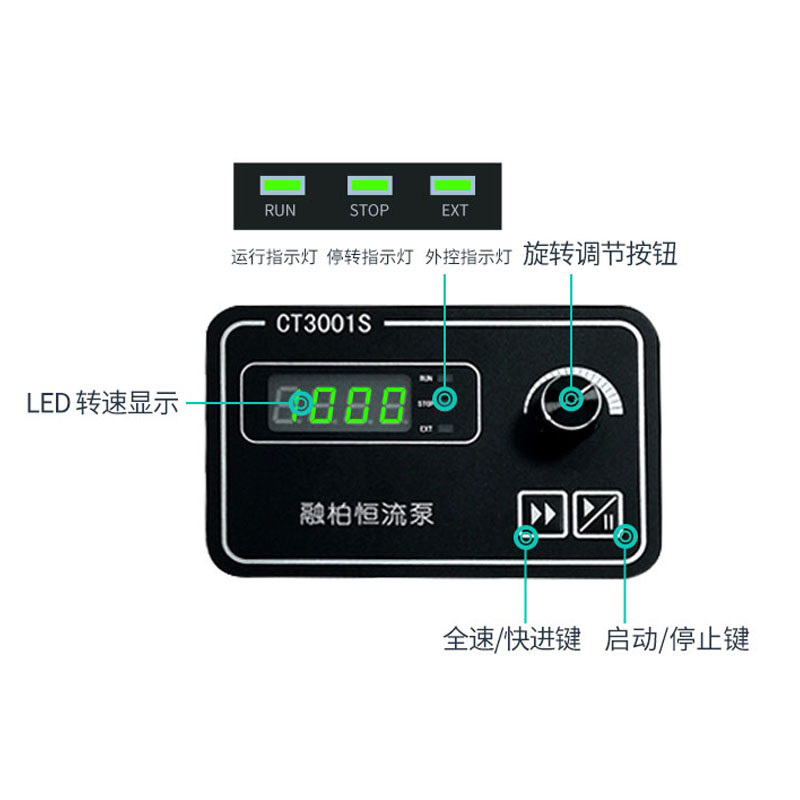 ▲旋轉編碼器調節轉速,實體按鍵控制啟/停,操作簡單便捷;還設有全速鍵,可實現快速填充或排空
